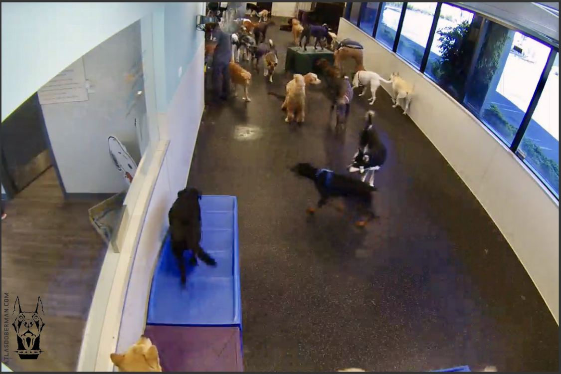 Atlas receives his much needed socialization with other dogs. But since he hasn’t really been in a room full of other dogs, getting him acclimated may take some time. I noticed that he gravitates toward the humans in the open play area before he opens up and begins playing with the other dogs.